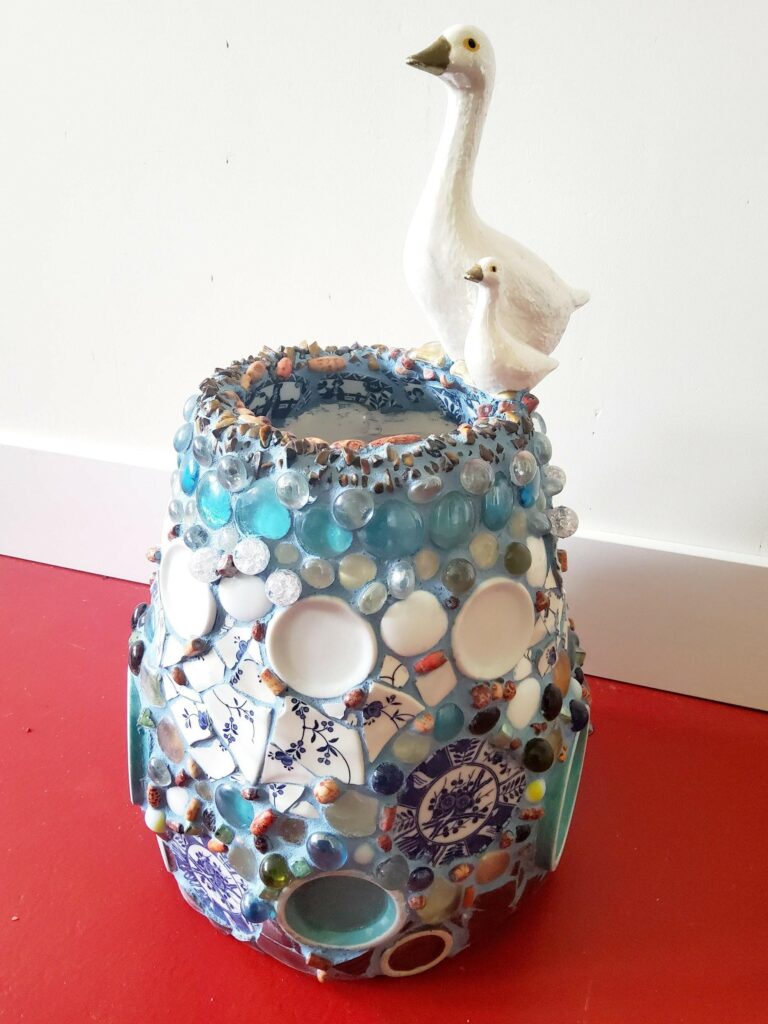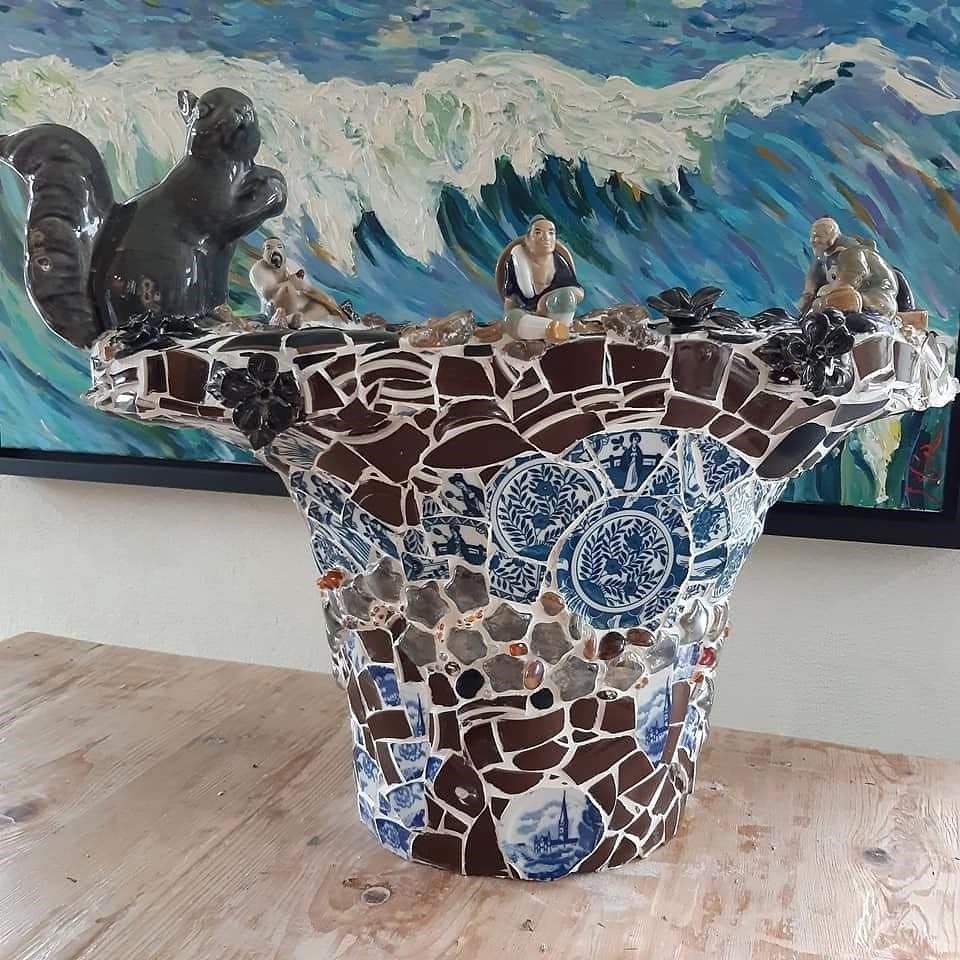 Een vriendschap die verdwijnt, wordt vervangen door een nieuwe vriendschap die opbloeit. Zo is het leven. Wordt het kinderboek niks, dan ga ik wel weer mozaïek vazen maken. Dat vind ik zo leuk om te doen. Kringloop-kop-en- schoteltjes in stukjes knippen, mooie glazen steentjes uitzoeken, een bijpassend beeldje erbij voegen en dan van al dat materiaal iets heel eigens te maken. Ik voeg wel wat foto’s voor je toe, dan heb je een idee. Ik heb er nu vijf klaar en er staan vier nieuwe in de startblokken. Mijn vrienden zeggen dat ik moet exposeren, zo mooi zijn ze, zeggen ze. Maar ik heb energie om ze te maken, niet meer om ze tentoon te stellen. Maakt me dat wat uit? Nee. Vincent van Gogh heeft tijdens zijn leven ook niet veel verkocht, zijn werk werd pas na zijn dood populair. Maar hij had het plezier van het maken en ik ook. Dus het plezier zit in het nu.