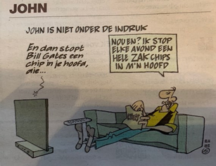 Het geeft me wel te denken: als we in 2027 (en daarna) afhankelijk zijn van dit soort types om de wereld te redden, dan zie ik het somber in. Je mag het niet zeggen (ik doe het lekker toch), maar misschien kan Bill Gates à la de cartoon op pagina twee alsnog een chip ontwikkelen om mensen wat milieubewuster te maken? Ik zou willen dat er sensoren op de straat zijn in 2027 die precies registreren wie wat op straat gooit, en dat de overtreder daar dan automatisch voor bekeurd wordt. Maar ook dat je na iedere vijftigste of honderdste zak (plastic) afval die je in een container gooit, beloond wordt door de gemeente, voor mijn part met een digitale tegoedbon (dan heb je speciale vuilniszakken nodig op naam of huisnummer die dat registreren, liefst biologisch afbreekbaar).